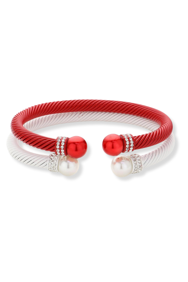 The Rolled in Red and White Cuff Set features red and white cable cuffs, each finished with a colored faux pearl at the end. This set offers a simple yet bold statement, perfect for adding a touch of elegance to any look.