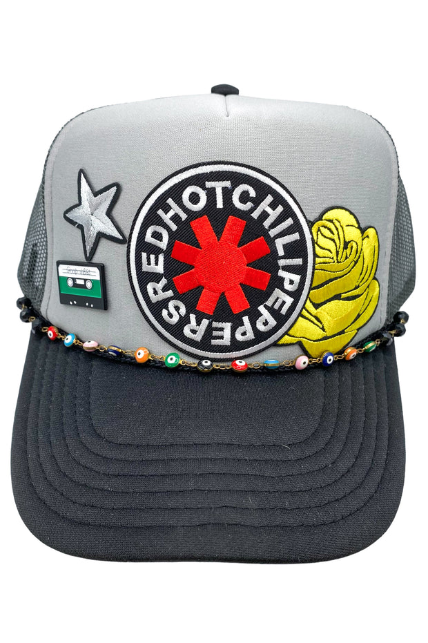 Upgrade your style to the next level with our So Hot Trucker Hat. This grey trucker hat features a unique patch work design including a silver star, golden rose, cassette, and our band logo. Elevate your streetwear game and show off your love for style.