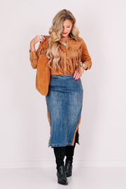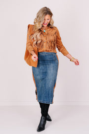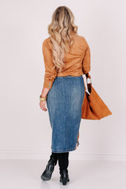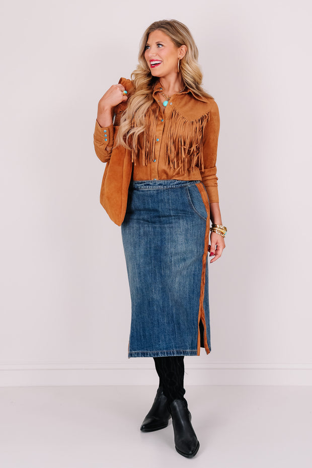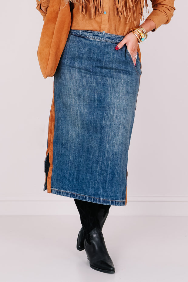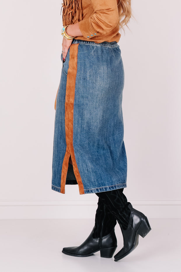 The Dale Denim Pull On Midi Skirt features a comfortable elastic pull-on waistband and side pockets for convenience. A brown suede strip runs down the side, adding a unique touch to this classic denim skirt.