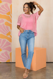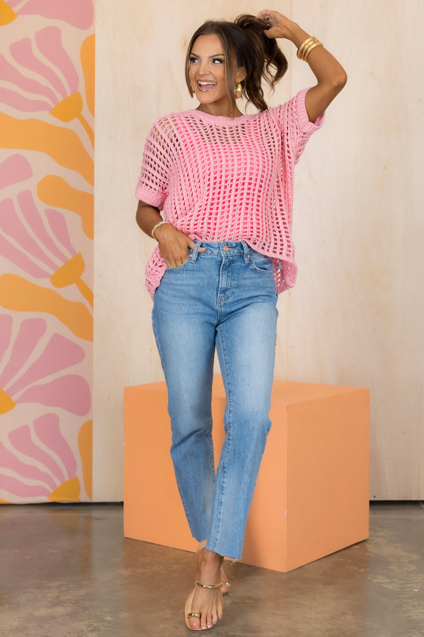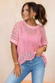 The rounded neckline and waist length create a flattering silhouette, while the short sleeves add a touch of elegance. Made from delicate crochet material, this sweater exudes sophistication and exclusivity.