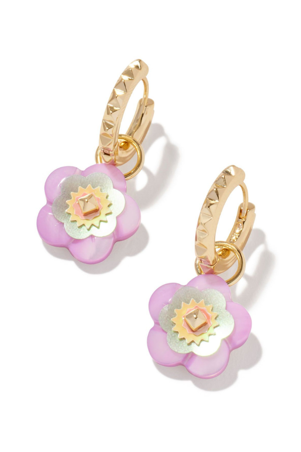 The Deliah Gold Huggie Earrings in Pastel Mix feature darling flower charms made from collaged sequins, our newest design innovation we can’t get enough of. If you’re wanting an all-metal moment, you can easily remove the charms for a whole new look.