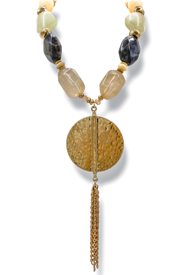 This Timeless Touch Statement Necklace features a stunning disc tassel design with a beautiful stone centerpiece. Elevate any outfit with this elegant and versatile necklace,