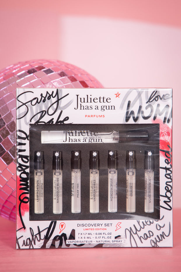 Set includes a 5ml Format of Not A Perfume and 17ml formats of Lust In The Sun, Magnolia Bliss, Pear INC., Vanilla Vibes, Moscow Mule, MMMM..., And Musc Invisible
