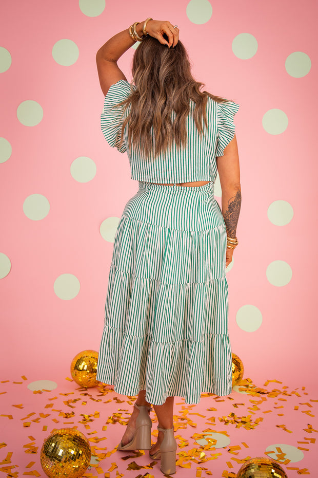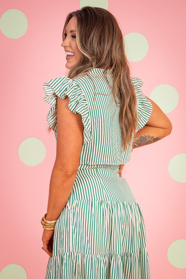 The All Around Dress is a sophisticated addition to any wardrobe. With a flattering v-neckline and charming ruffled short sleeves, this dress features a trendy striped print and is fully lined for comfort and coverage. The open back adds a touch of elegance, while the midi length is perfect for any occasion.