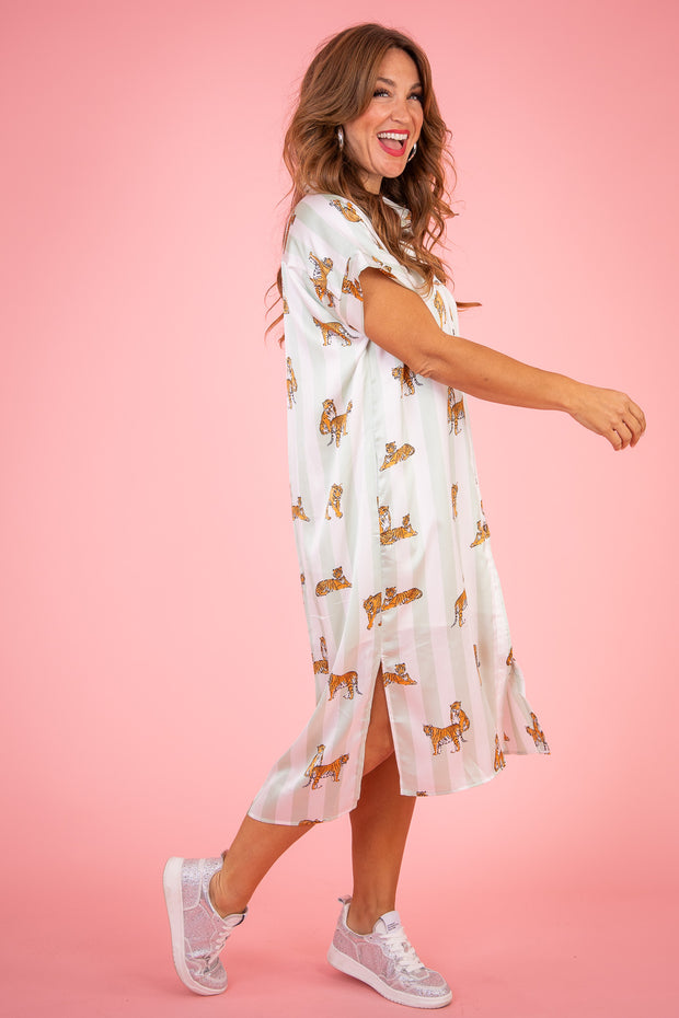 Experience the ultimate combination of style and comfort with our Wild Thing Dress. Featuring a top collar and short sleeves, this midi dress is perfect for any occasion. The button down front adds a touch of elegance, while the silky material and striped print provide a luxurious feel. Embrace your wild side in this must-have dress.