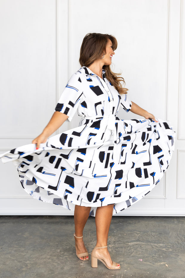 Elevate your wardrobe with our Jackie Dress. This midi-length dress features a trendy button-down front, short sleeves, and a top collar. The waist tie cinches your waist for a flattering silhouette, while the abstract print adds a touch of modernity. Perfect for any occasion, this dress is a must-have for any fashion-forward individual.