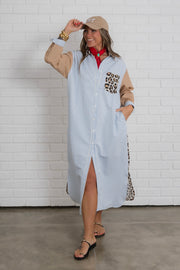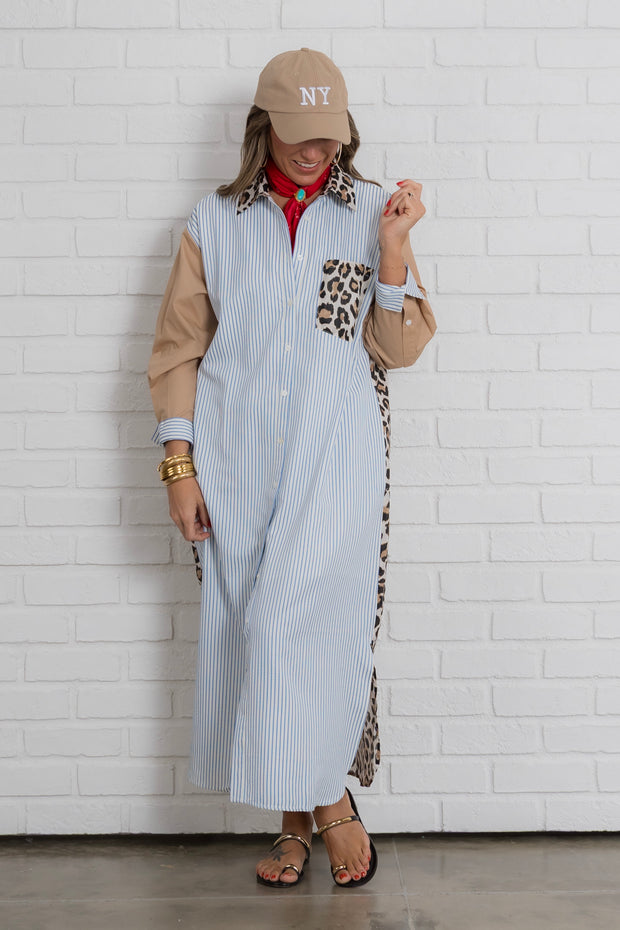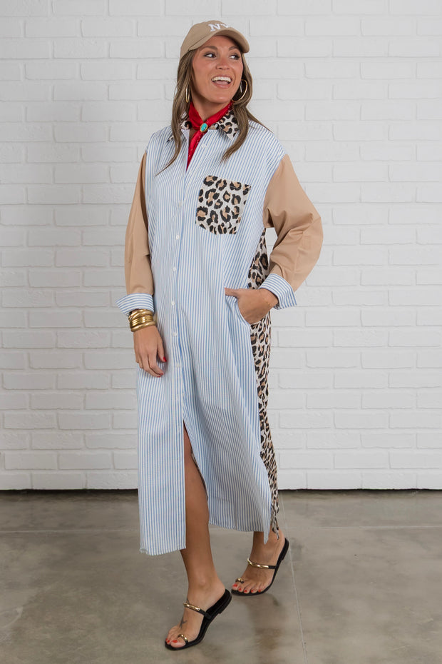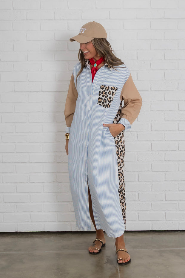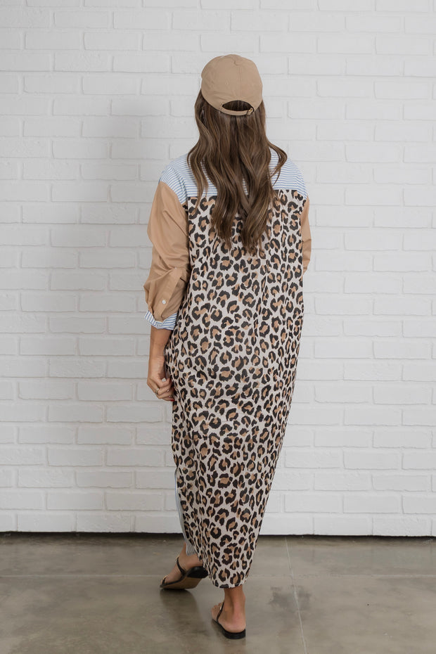 The button down front adds a touch of sophistication while the striped detailing and leopard print add a playful touch.