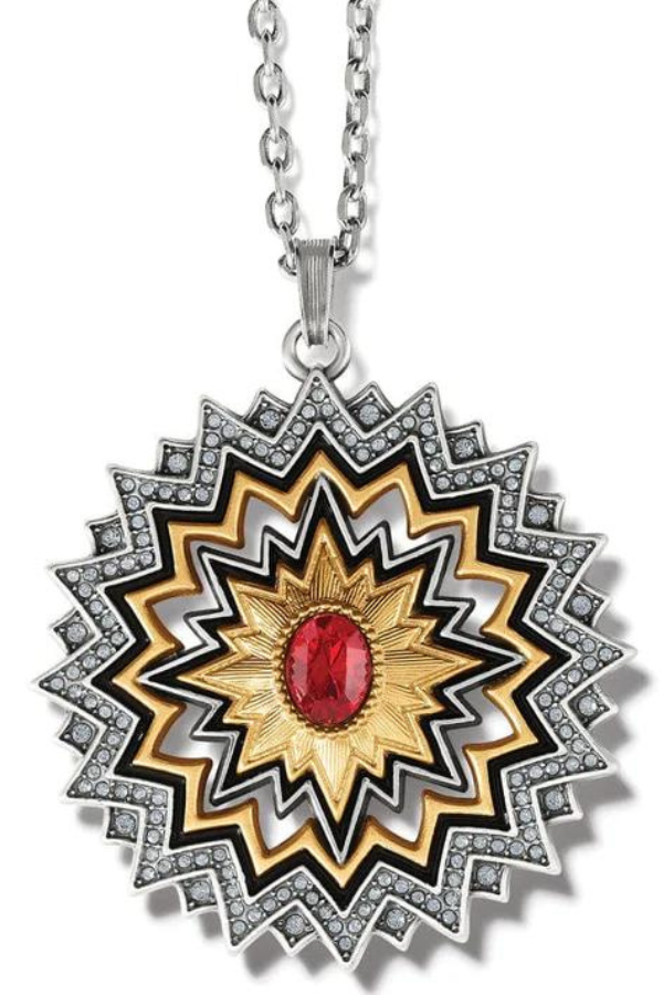 Dynasty Sol Necklace, Inspired by the sun, this wonderfully detailed necklace has a gold brushed finish surrounding a radiant red center crystals that gives it a majestic look.