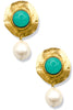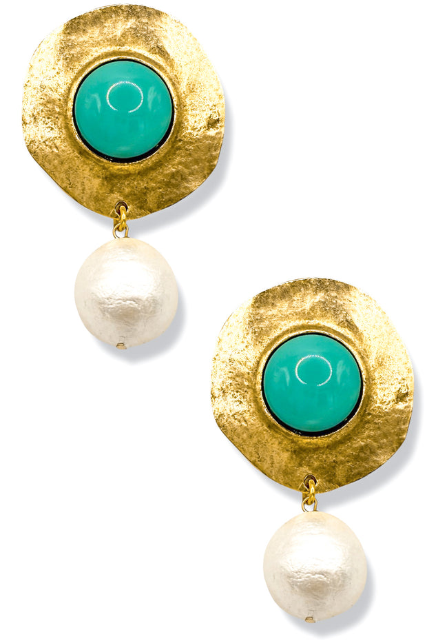 Crafted with gold and adorned with a pearl and turquoise accent, these earrings add a touch of elegance to any outfit. Elevate your style and confidence with these stunning earrings today.