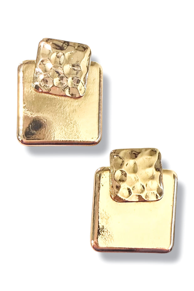 Elegant gold square earrings featuring double metal links in a layered design. Timeless geometric style perfect for everyday wear or special occasions. Versatile and sophisticated.