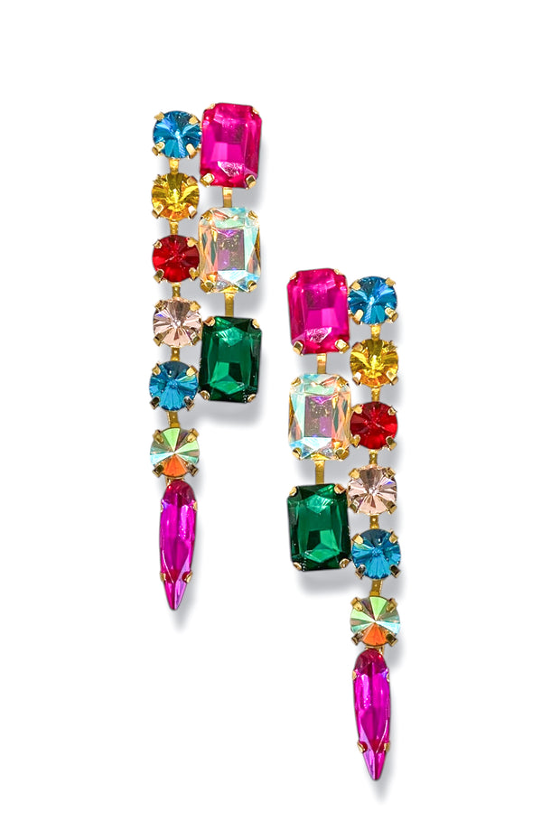 These earrings feature multi-shaped stone links that create a striking drop design. Perfect for evening occasions, they add a touch of elegance and glamour to any outfit.