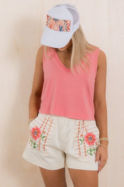 These Shorts feature an elegant ecru color and delicate floral embroidery, with a comfortable elastic pull on waist band and breathable material.