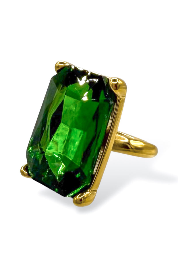 Expertly crafted, this statement ring features a stunning emerald cut green stone. With its sleek design and eye-catching color, this ring is sure to make a bold impression. Perfect for adding a touch of elegance to any outfit.