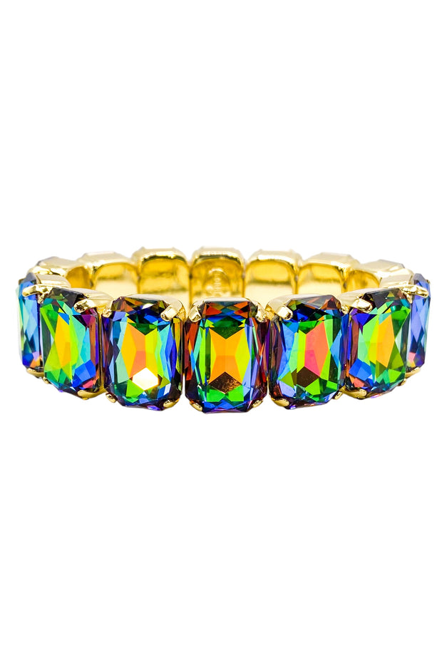 The Emerald Cut Stretch Bracelet features repeating emerald cut crystals on a multi-layered stretchy jewelry filament, creating a durable and trendy statement piece.