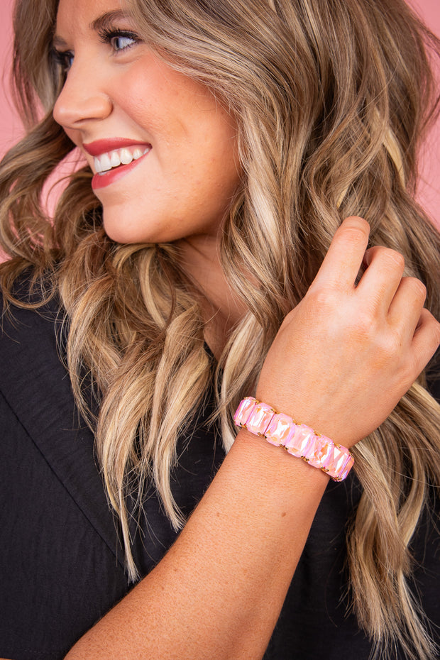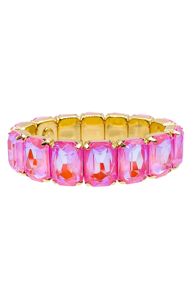 The Emerald Cut Stretch Bracelet features repeating emerald cut crystals on a multi-layered stretchy jewelry filament, creating a durable and trendy statement piece. Perfect for layering or styled by itself.