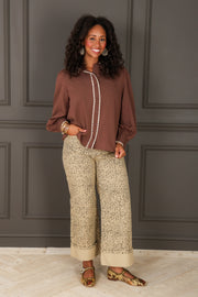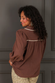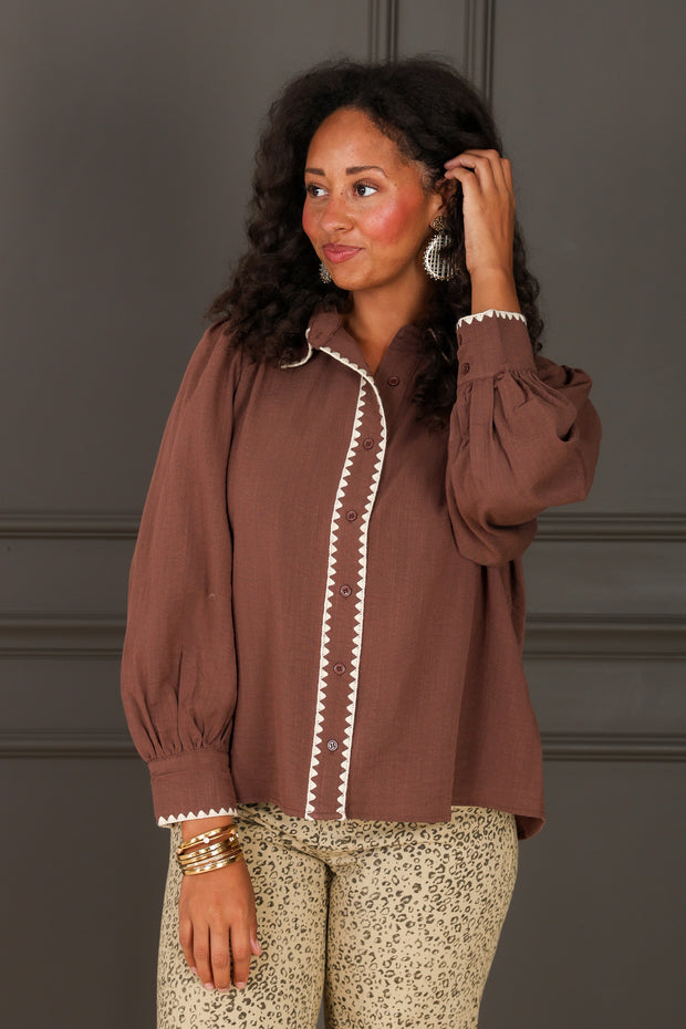 This blouse features a top collar and long sleeves, combining classic style with comfort. The button-down front and waist-length cut create a flattering, versatile look perfect for everyday wear or the office.