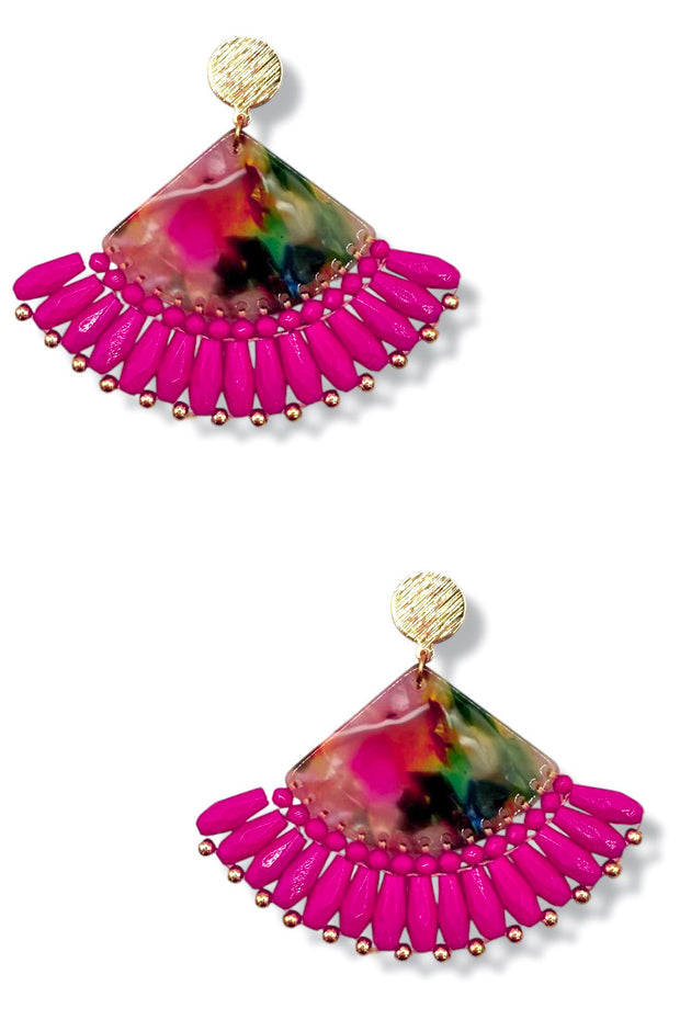 Featuring a fan shape design with vibrant fuchsia beads and resin. With their unique shape and striking color, these earrings are the perfect statement piece for any outfit.