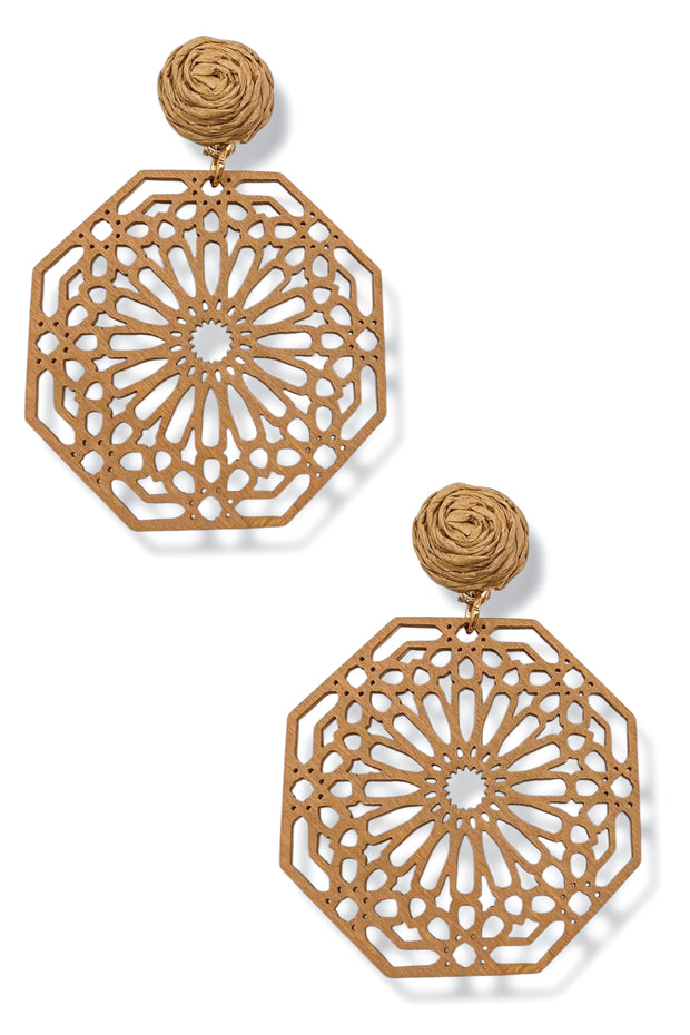 Crafted with intricate filigree wood in a unique octagon shape, these earrings exude sophistication. The addition of raffia adds a touch of texture and luxury to these statement pieces.