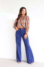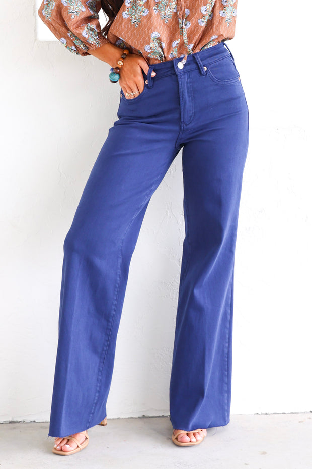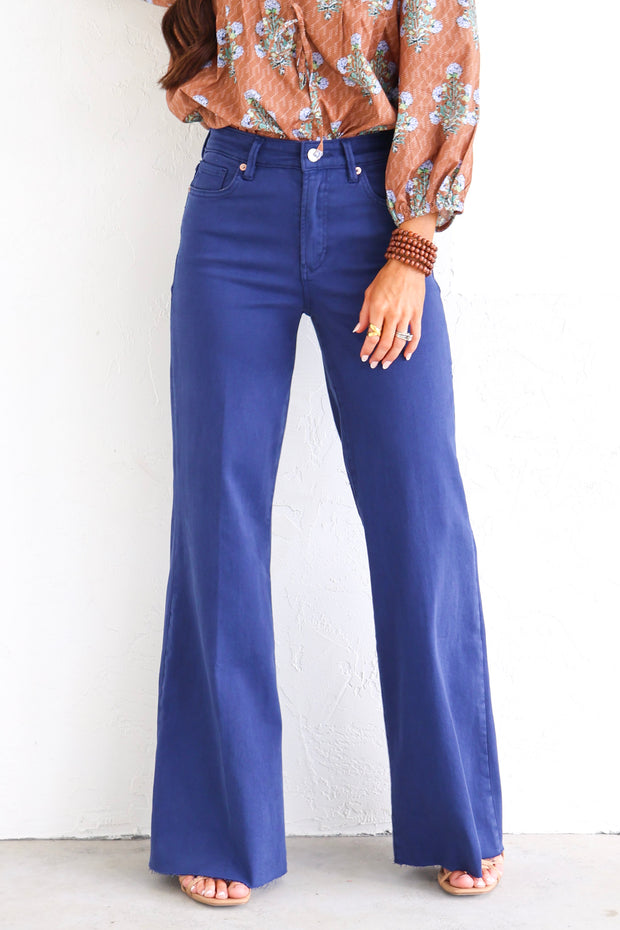 Super high rise wide leg jeans. It's cozy fit that sits at natural waist, embraces your natural curves and accentuates your hips and thigh. Full inseam on stretch denim featuring cut-off hem details add flair to these soft pants, available in designer colors, and finished with a center inseam press for a tailored look.