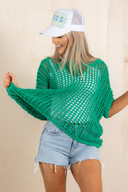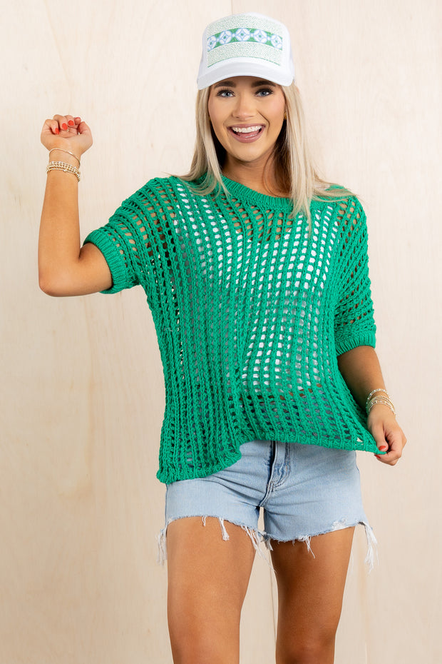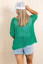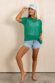 This top is perfect for warmer days with its breathable and comfortable material. The crotchet detailing adds a unique touch to the short sleeve and round neck design. Stay stylish and cool with this must-have sweater.