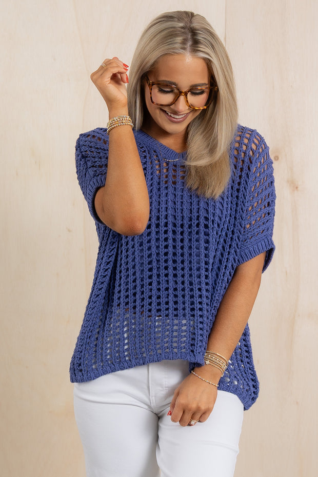 This top is perfect for warmer days with its breathable and comfortable material. The crotchet detailing adds a unique touch to the short sleeve and round neck design. Stay stylish and cool with this must-have sweater.