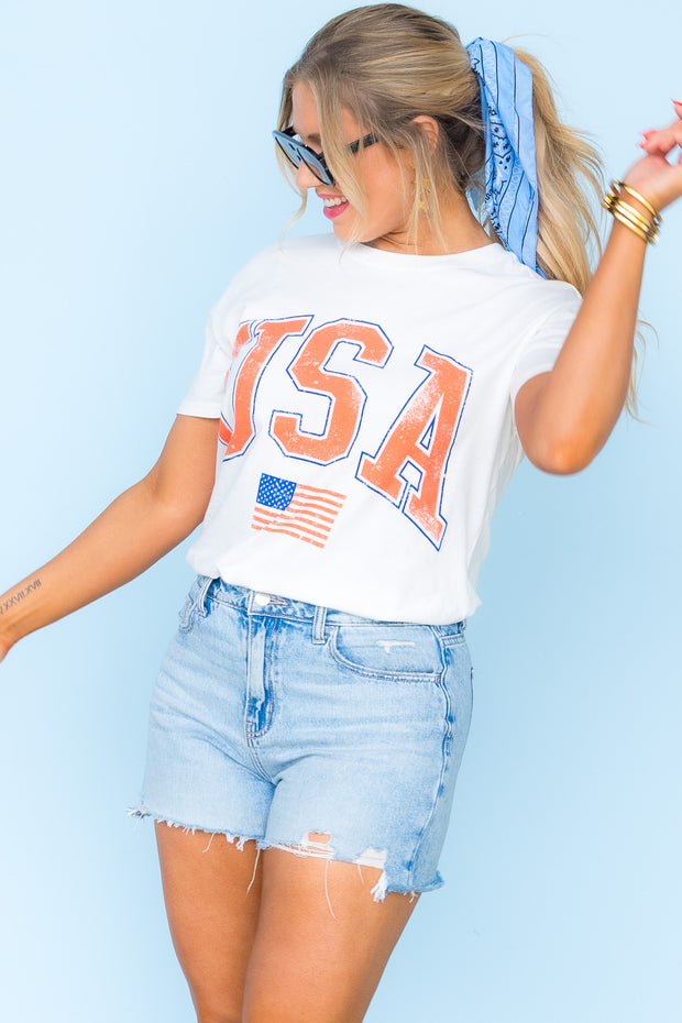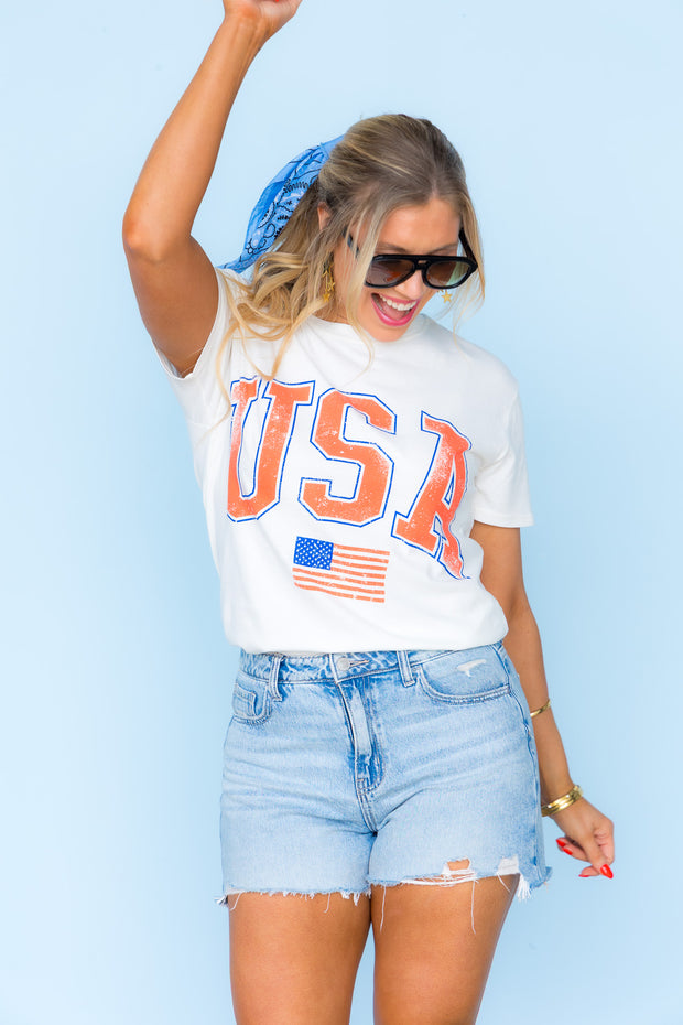With a rounded neckline and short sleeves, this top offers a comfortable fit. The waist length design adds a stylish touch, while the USA graphic on the front showcases your patriotic spirit.