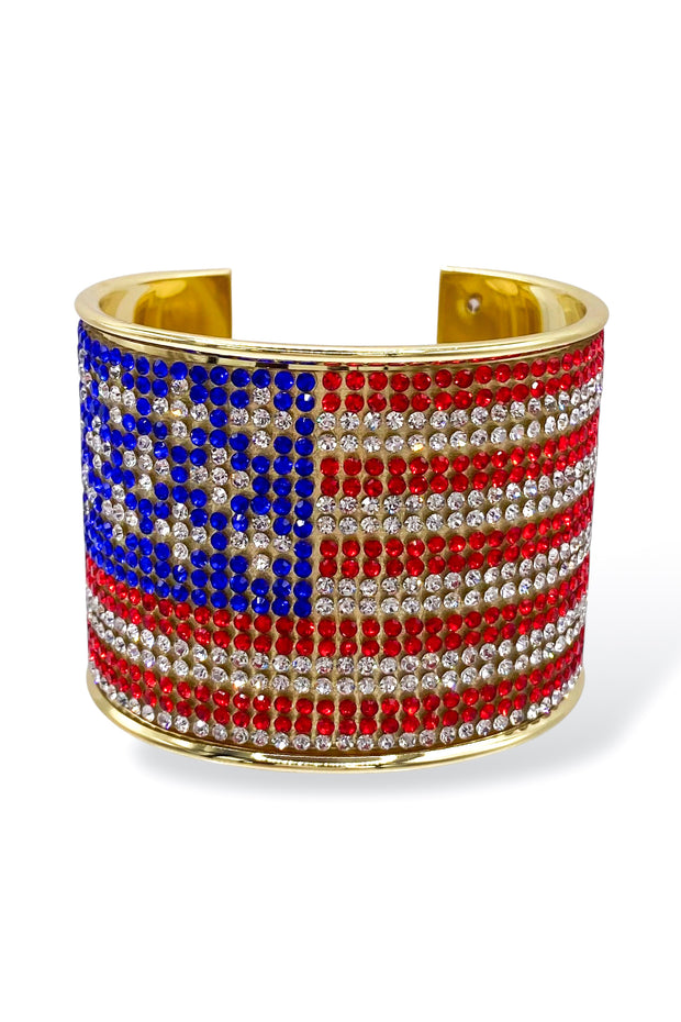 This statement cuff bracelet showcases sparkling detailing arranged in a flag design. Elevate your patriotism with The American Way Flag Cuff Bracelet. Made for those who appreciate expert craftsmanship and bold, yet elegant design.