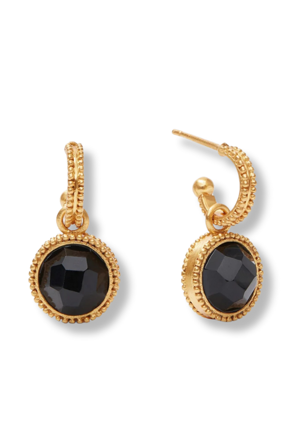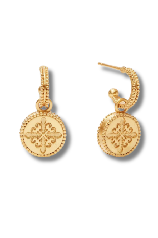 One earring, two ways to wear it—one side features a glittering gemstone, while the reverse side features a fleur-de-lis intaglio.