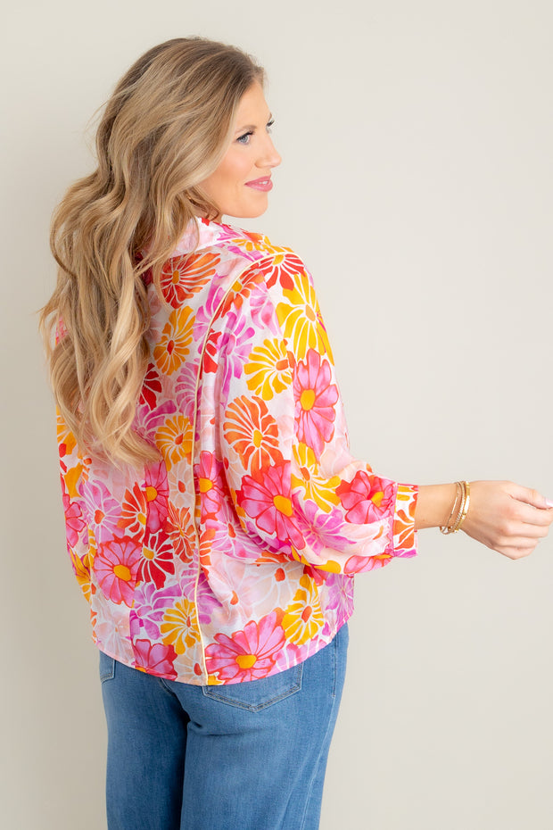 Introducing this Blouse, featuring a top collar, dolman short sleeves, and a striking floral print. Its waist-length design and button down front exude elegance and sophistication, making it the perfect addition to any high-end wardrobe.