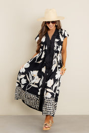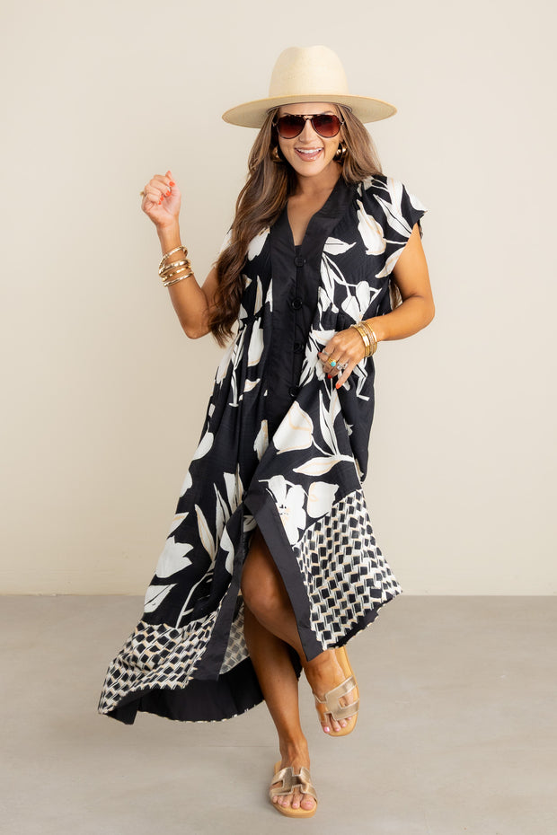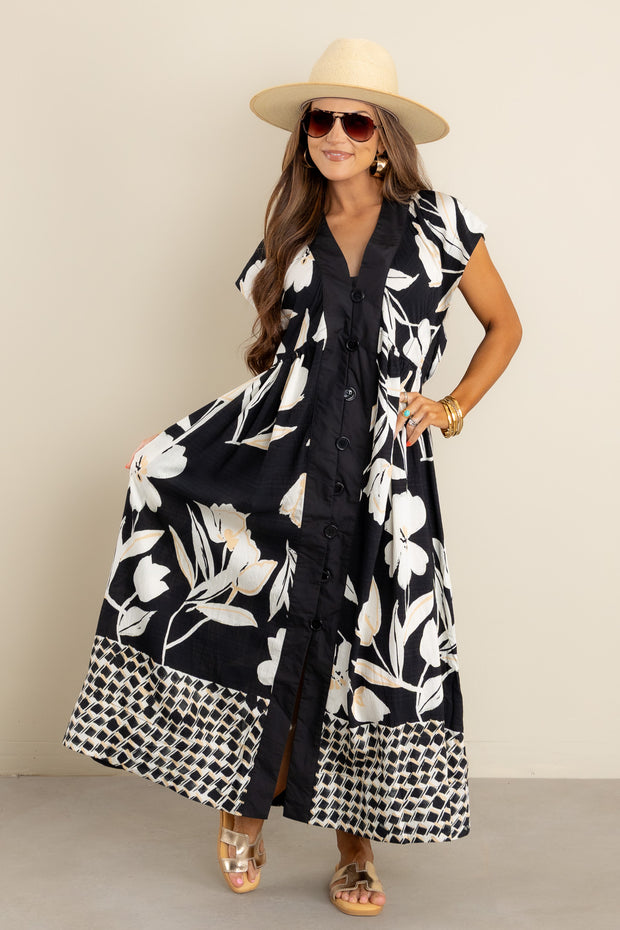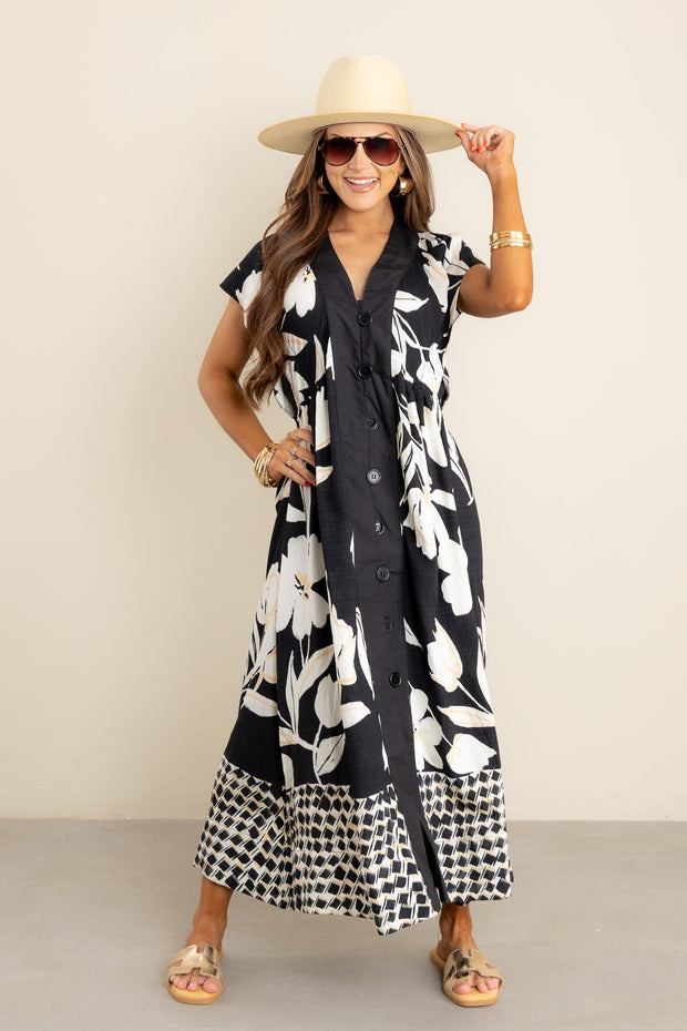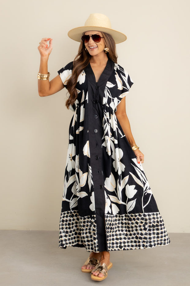 Introducing this Midi Dress, featuring a classic v-neckline and elegant button down front. Made with luxurious fabric, this dress boasts short sleeves and a chic floral print.