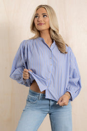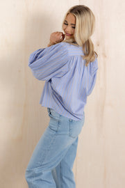 This long sleeve, button down top features a blue striped v neckline, offering a touch of elegance. Crafted with breathable and comfortable fabric, it's perfect for any occasion. Model, our model, is wearing a size Small.
