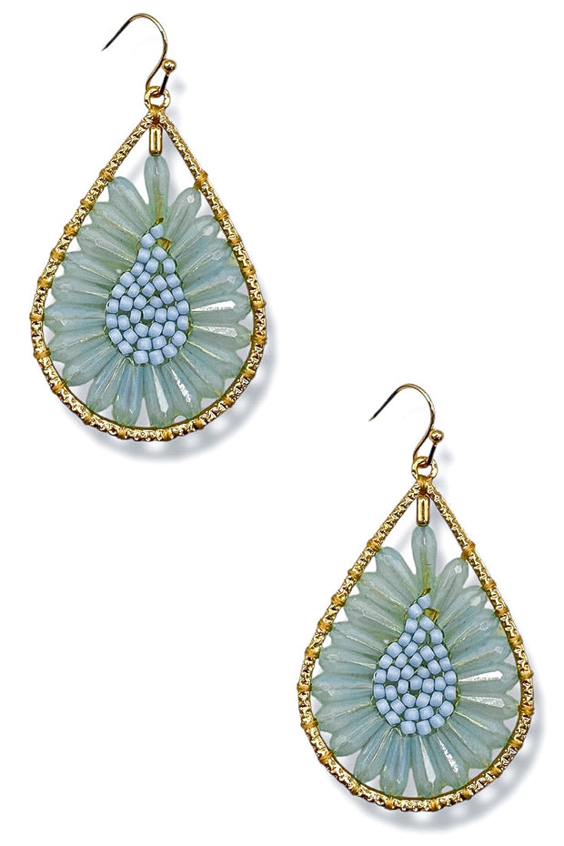 These elegant earrings feature a beautiful teardrop shape, adorned with blue beads for a simple but sophisticated look. Perfect for any occasion, these earrings are sure to add a touch of class to any outfit.