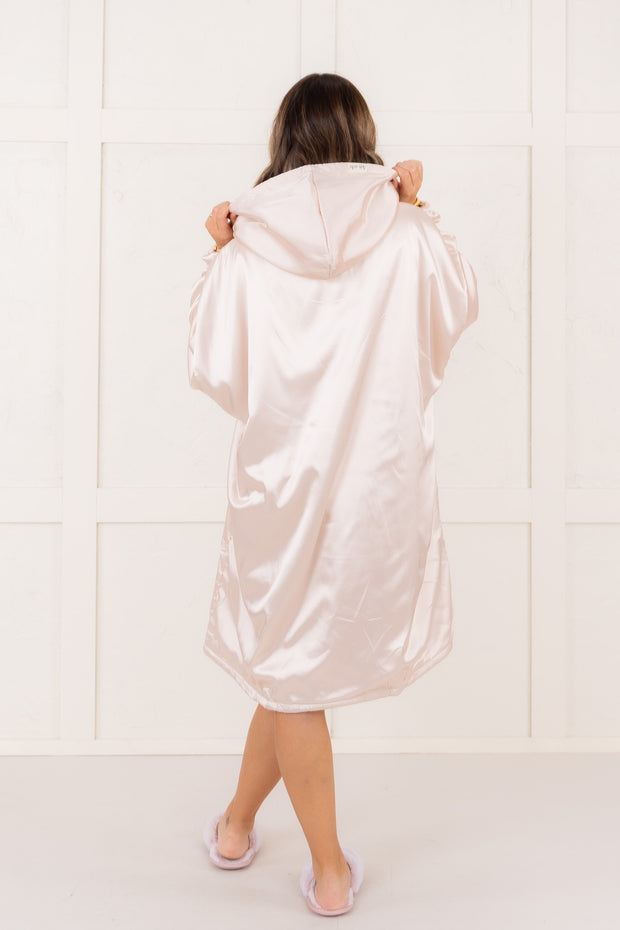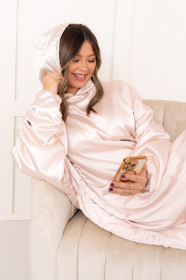 This blush Glazey Satin Hoodie from Kitsch is made with smooth satin material, providing a luxurious feel. The pullover style makes it easy to throw on, while the hooded back adds an extra touch of comfort. Perfect for adding a touch of glamour to any casual look.