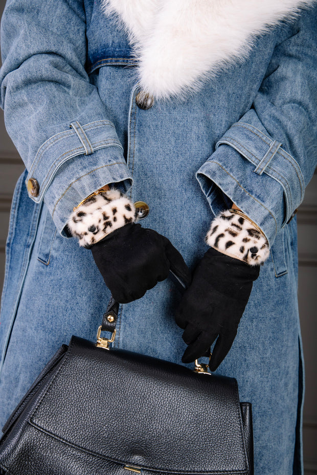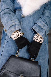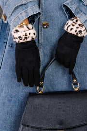 These gloves feature a stylish leopard faux fur cuff that adds a cozy touch. Designed for cold weather, they keep your hands warm while allowing you to use touchscreen devices without removing the gloves. Perfect for everyday use in chilly conditions.