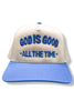 Introducing our exclusive God is Good hat, featuring a blue and ivory cap with elegant "God Is Good, All The Time" embroidery. Stay stylish and show your faith with this sophisticated accessory.