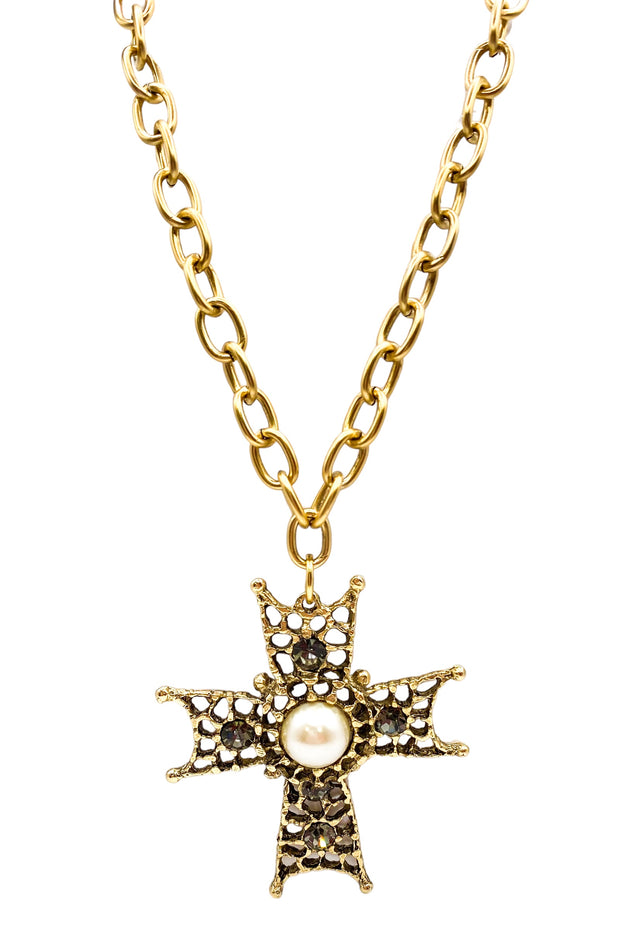 This Highest Point Necklace features a paper clip chain with a beautiful cross pendant adorned with pearl and crystal detailing. Crafted from the finest materials, this necklace will add a touch of elegance to your jewelry collection.