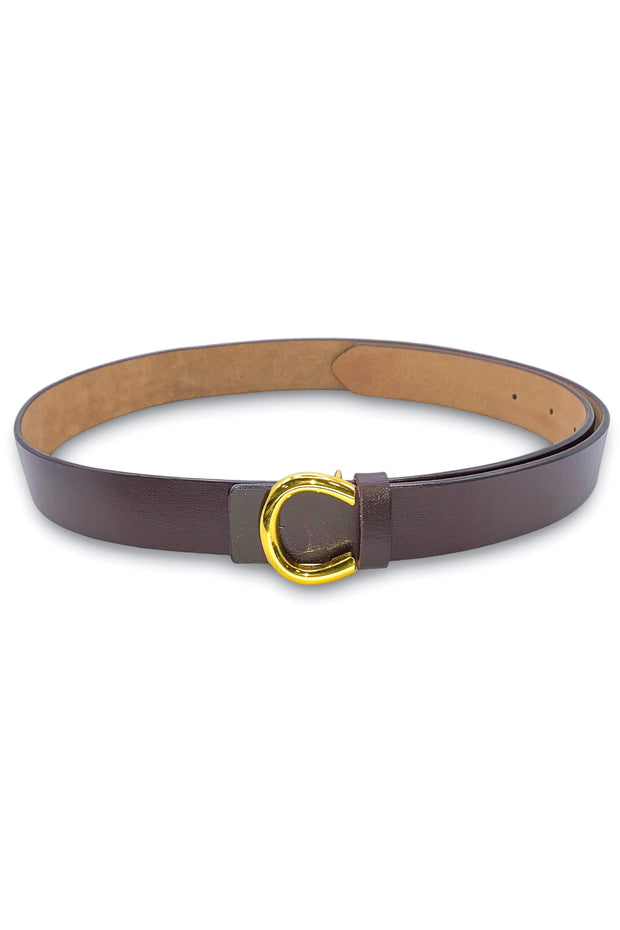 Crafted with 100% genuine leather, the Hear Me Out Belt in brown is designed for durability and style. The gold horseshoe buckle adds a touch of elegance, making it a versatile accessory for any outfit. Elevate your wardrobe with this expertly crafted leather belt.