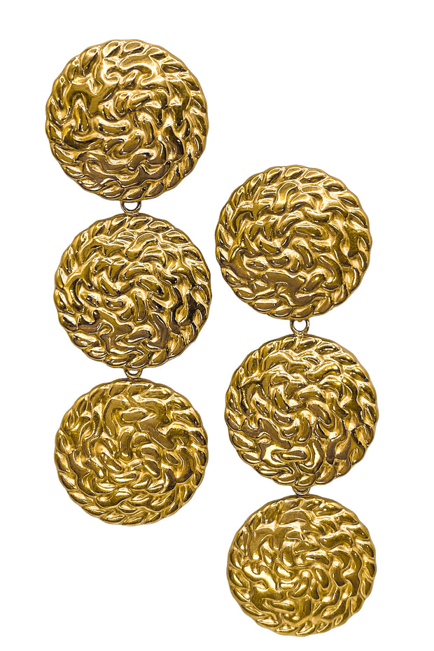 Crafted with elegance, the Kayla Earring in gold boasts a unique design of hammered triple circles that delicately dangle from your ears. This subtle yet stylish accessory adds a touch of sophistication to any outfit, making it the perfect addition to your jewelry collection.