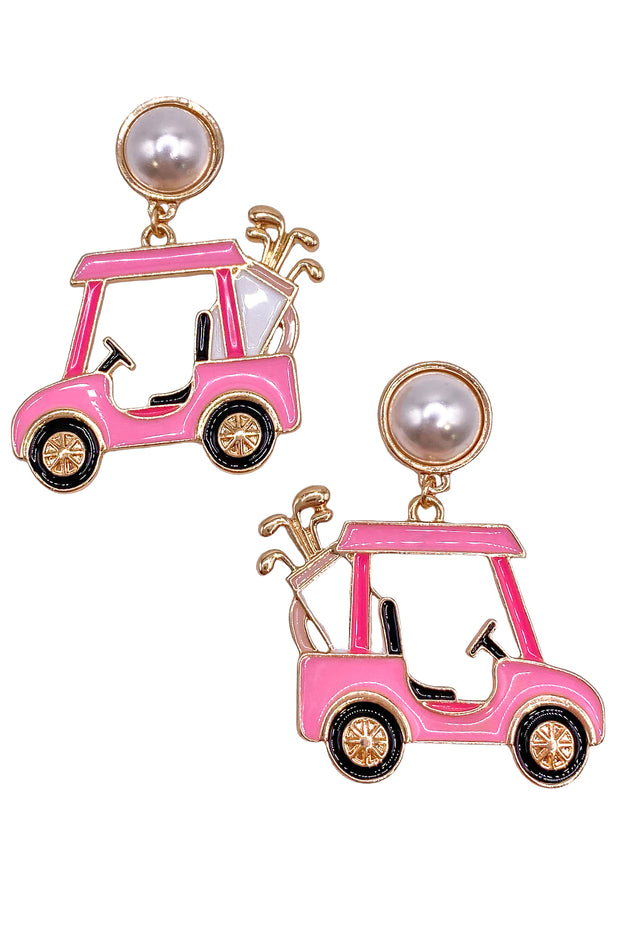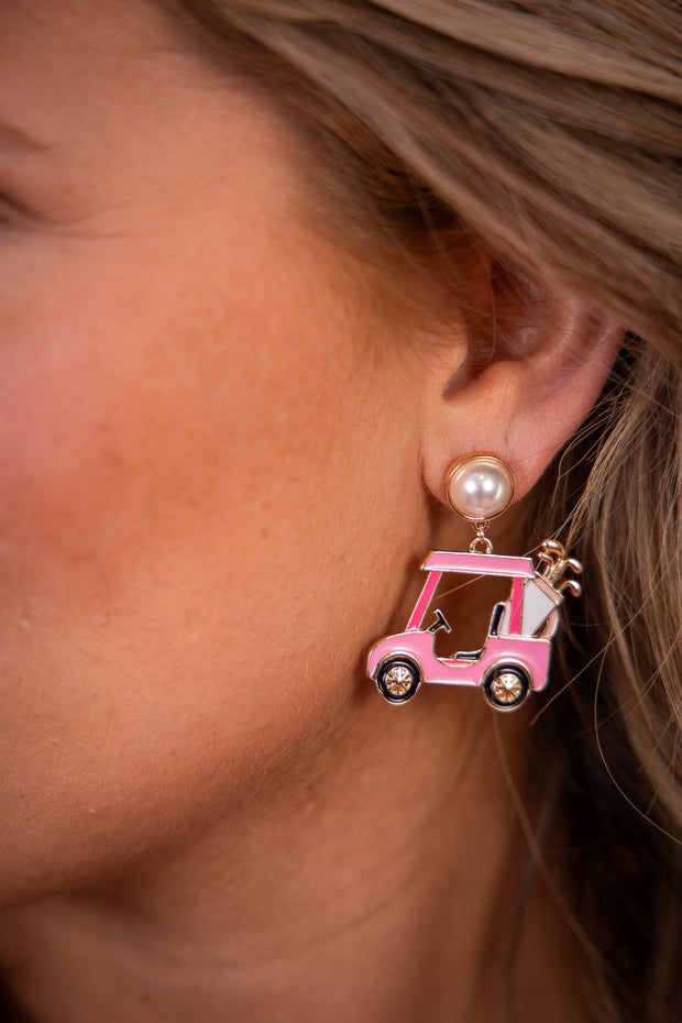 The Cart Girl Earring is a unique and stylish earring that features a post pearl design with a charming pink golf cart and golf club drop. Perfect for any golf lover, this earring adds a touch of fun and sophistication to any outfit. Made for comfort and durability, it is sure to be a favorite accessory.