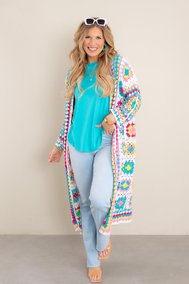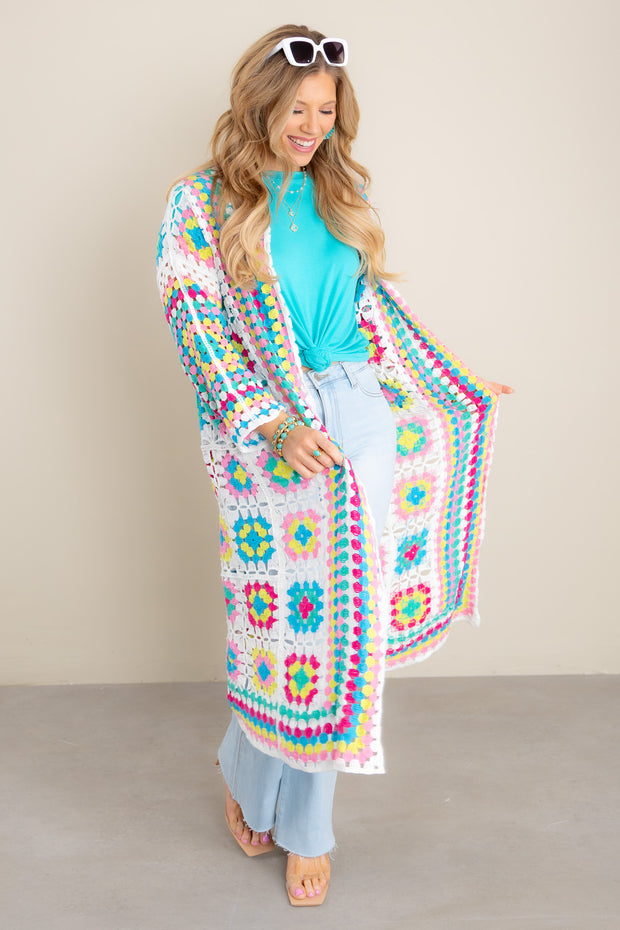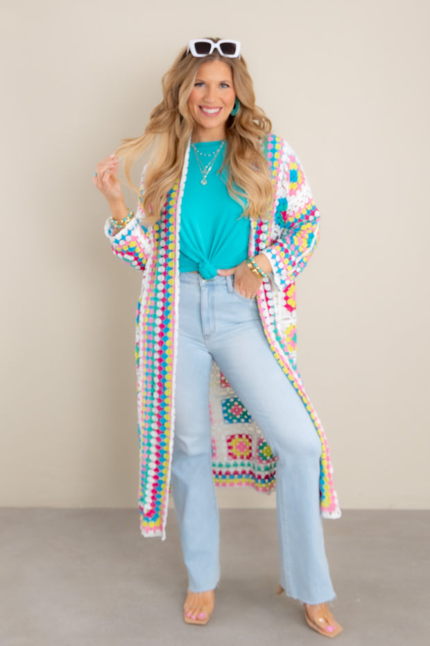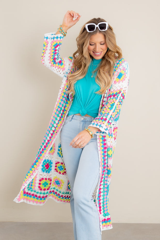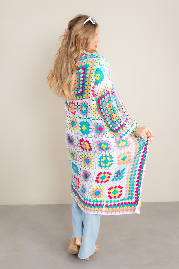 Adorned with a beautiful, multi-colored crochet pattern, this midi-length cardigan is the perfect addition to your wardrobe. Featuring an elegant open front design and long sleeves, this sophisticated piece will elevate any outfit.