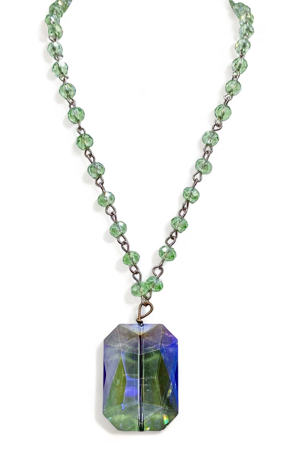 Introducing the Kennedy Pendant Necklace. This green beaded necklace features a beautifully faceted pendant, adding a touch of elegance to any outfit. Elevate your style with this eye-catching accessory.