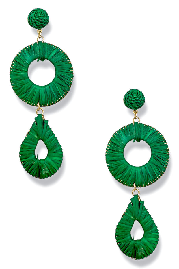 Expertly handcrafted with raffia, these unique earrings feature a delicate circle and teardrop design. Add a touch of natural elegance to any outfit with these versatile accessories.