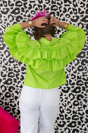 Featuring a structured top collar, long sleeves, and a button down front, this top is perfect for any occasion. The ruffle and rhinestone detailing add a touch of elegance and charm.