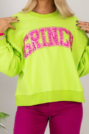 This cozy long-sleeve sweatshirt features a rounded neckline, waist-length fit, and sparkling rhinestone "Grinch" lettering for festive sparkle and comfortable style.