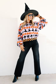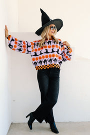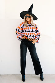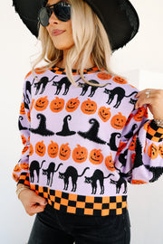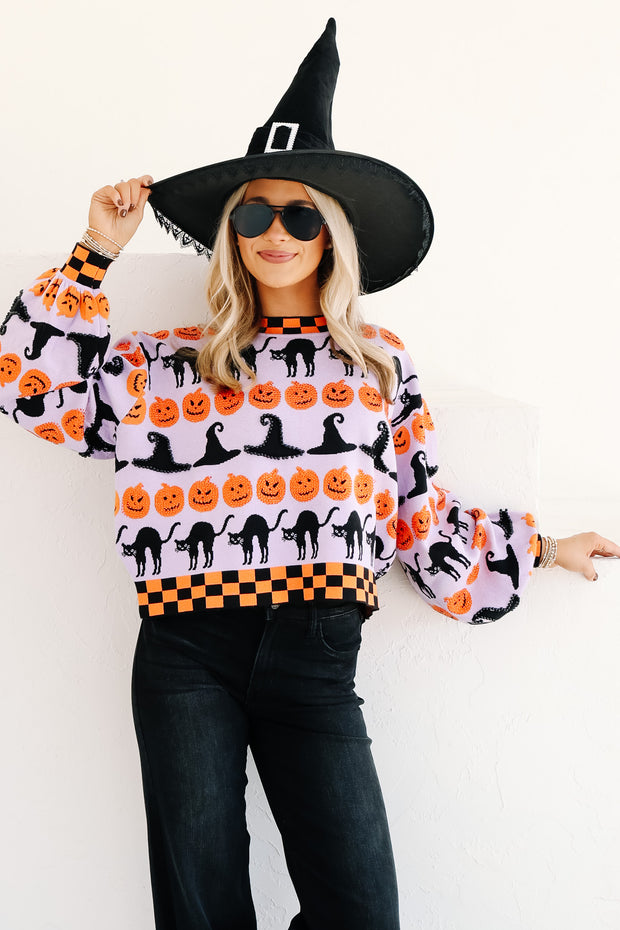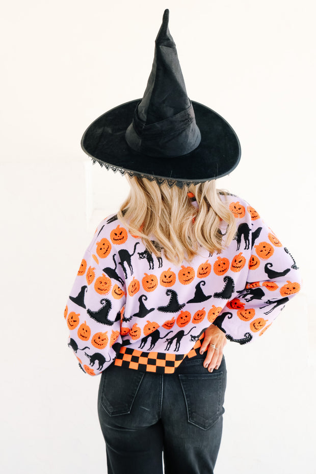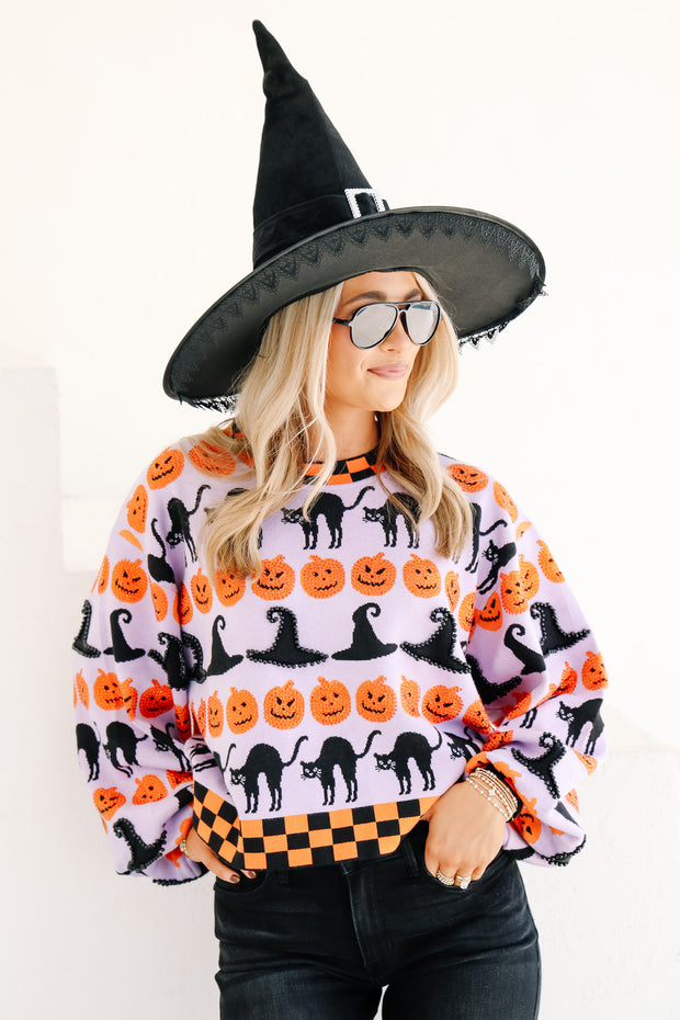 This lavender long sleeve sweater features a round neckline and is adorned with rhinestone and beaded jack-o'-lanterns, witches' hats, and black cats. Orange and black checkered detailing on the collar, neckline, and hemline adds a festive touch to this charming Halloween piece.