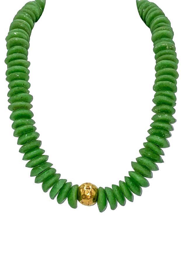 Add a pop of color to your outfit with our Kinlee Necklace in green. The disk stone necklace features a unique gold bead detail, adding a touch of fun to your look. Stand out in style with this trendy accessory.