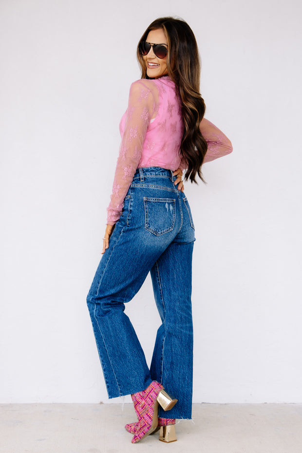 The One Too Late High Rise Straight Leg Vintage Dark Blue Jean features a classic zip and button closure with front and back pockets for convenience. The small distressing on the thigh adds a subtle vintage touch to its timeless straight-leg design.