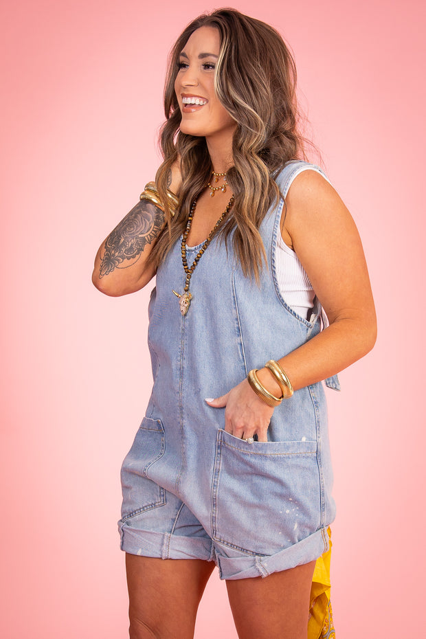 Expertly crafted from light washed denim, the High Roller Shortall by Free People features functional pockets and adjustable straps for a personalized fit. With its slouchy silhouette, this shortall combines style and practicality, making it a must-have for any fashion-forward individual.