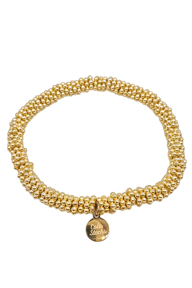 Enhance your style with the Holly Bracelet by Cola Stacks. This 6mm gold plated bracelet features a 7-inch elastic stretch band for a comfortable and secure fit. Elevate any outfit with this timeless and versatile piece. We love these paired by themselves or stacked!