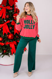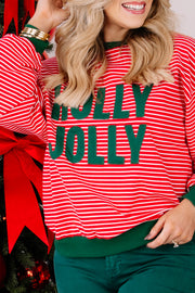 Festive pullover featuring a Holly Jolly graphic with red and green stripes. Rounded neckline and long sleeves provide cozy comfort, while the waist-length cut offers a flattering silhouette perfect for holiday celebrations.